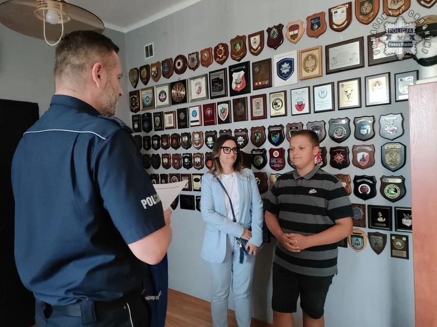 Wczoraj, Pierwszy Zastępca Komendanta Miejskiego Policji w Piekarach Śląskich, podinsp. Mateusz Gilge, spotkał się z Michałem oraz jego mamą, aby osobiście podziękować za odwagę i szybką reakcję. Michał otrzymał list gratulacyjny oraz pamiątkowe prezenty za swoją bezinteresowną pomoc i wzorową postawę.