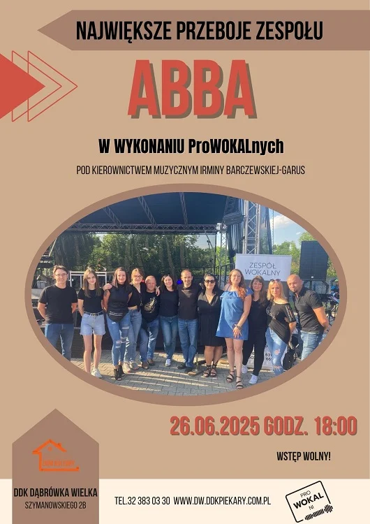 Już 26 czerwca o godz. 18:00 w Dzielnicowym Domu Kultury w Dąbrówce Wielkiej zabrzmią największe przeboje zespołu ABBA w wykonaniu grupy ProWOKALni. Za stronę muzyczną odpowiada Irmina Barczewska-Garus, która przygotowała z zespołem wyjątkowy program koncertowy pełen kultowych hitów szwedzkiej grupy.