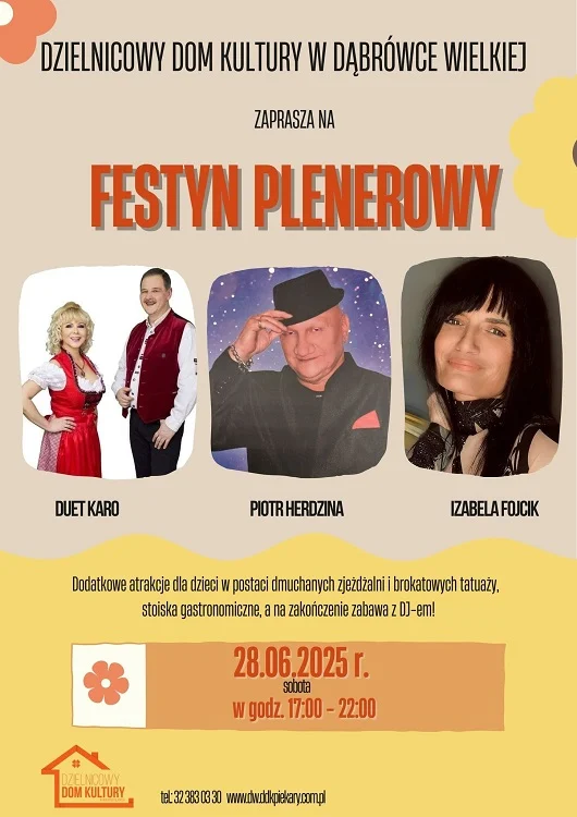Dwa dni później – 28 czerwca (sobota) – DDK zaprasza na barwny festyn plenerowy, który potrwa od 17:00 do 22:00. Na scenie pojawią się znani i lubiani wykonawcy: