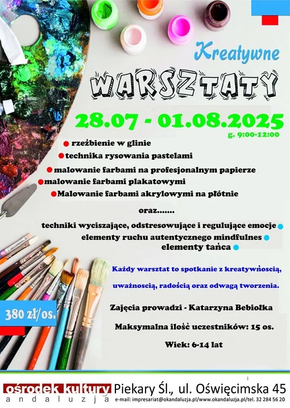 Pod koniec lipca, w dniach 28 lipca – 1 sierpnia, dzieci będą mogły wziąć udział w Kreatywnych Warsztatach z Katarzyną Bebiołką. Przez 5 dni, w godzinach 9:00–12:00, dzieci w wieku 6–14 lat będą miały szansę rozwijać swoje talenty. W programie: rzeźbienie w glinie, rysowanie pastelami, malowanie na papierze i płótnie, a także techniki mindfulness i tańca. Warsztaty to doskonała okazja, by dzieci nie tylko rozwijały swoje zdolności artystyczne, ale także odpoczęły od codziennego pośpiechu i stresu. Zajęcia będą się odbywać w małych grupach, co gwarantuje indywidualne podejście do każdego uczestnika.