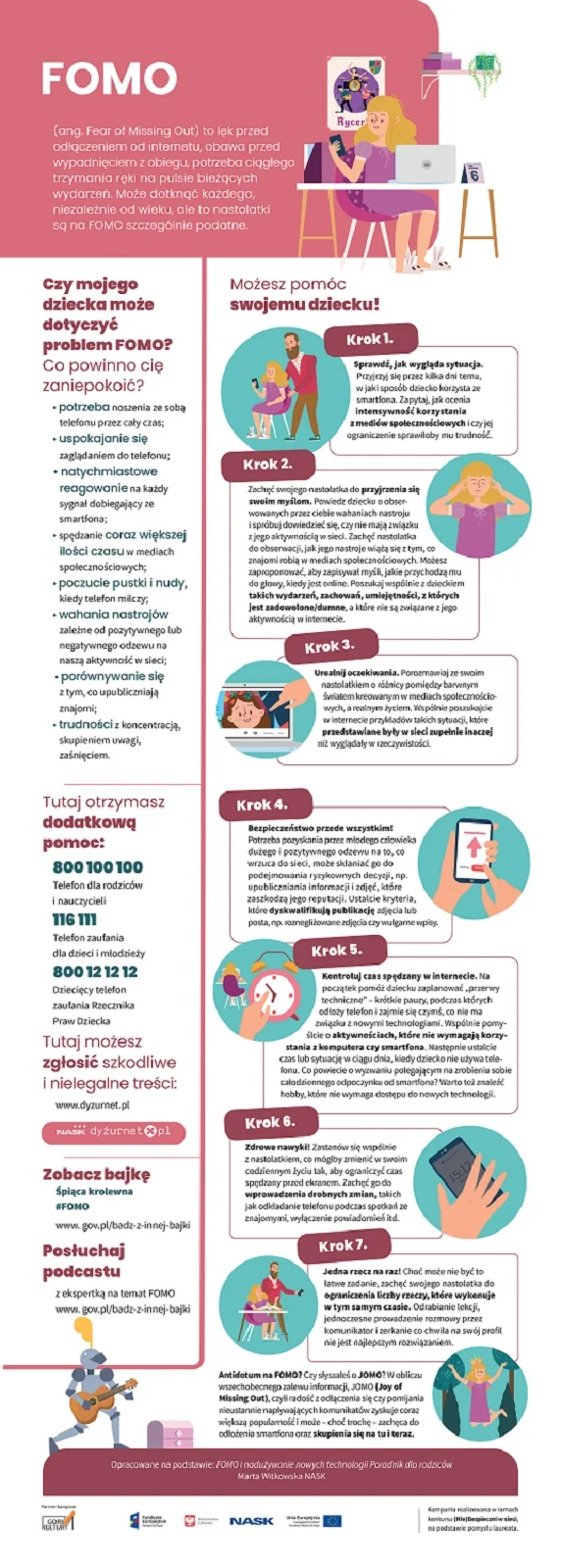 W dobie powszechnego dostępu do sieci dzieci coraz częściej doświadczają zjawiska FOMO (fear of missing out) – lęku przed byciem offline. Kampania „Bądź z innej bajki” zwraca uwagę, że świat wirtualny niesie zagrożenia równie realne jak ten codzienny – dlatego tak ważne jest, aby dorośli potrafili reagować i wspierać swoje dzieci.