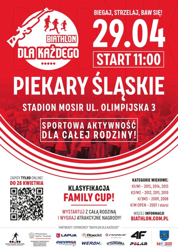 W sobotę 29 kwietnia 2023 r. po raz pierwszy w naszym mieście zorganizowana zostanie impreza sportowa “Biathlon dla każdego”. Organizatorem jest Polski Związek Biathlonu z siedzibą w Katowicach, zaś współorganizatorem Miejski Ośrodek Sportu i Rekreacji w Piekarach Śląskich.