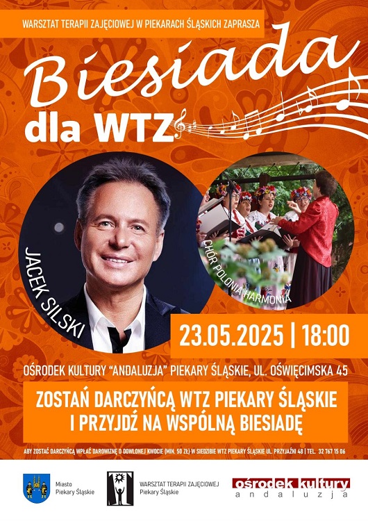23 maja o godz. 18:00 w Ośrodku Kultury „Andaluzja” odbędzie się Biesiada Darczyńców WTZ – wydarzenie, które łączy w sobie wdzięczność, integrację oraz dobrą zabawę. Na scenie wystąpią znakomici goście: Jacek Silski – znany i ceniony śląski wokalista oraz Śląski Chór Górniczy Polonia Harmonia.