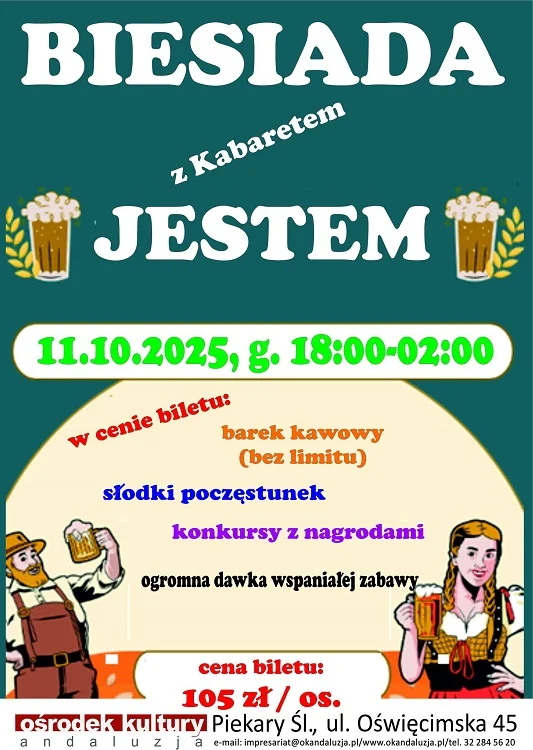 11 października w Ośrodku Kultury Andaluzja w Piekarach Śląskich odbędzie się wyjątkowe wydarzenie – Biesiada z Kabaretem JESTEM. To propozycja dla wszystkich, którzy cenią sobie wieczory pełne śmiechu, wspólnej zabawy i dobrego humoru.