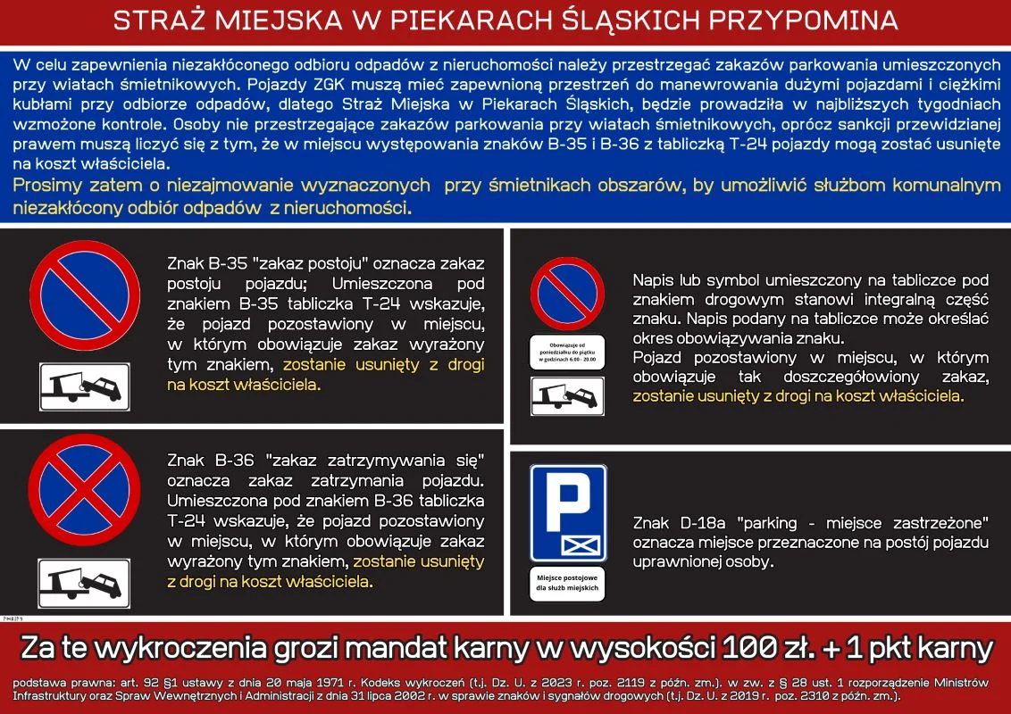 Aby temu zaradzić, Straż Miejska w Piekarach Śląskich w najbliższych tygodniach przeprowadzi wzmożone kontrole na osiedlach, aby upewnić się, że mieszkańcy przestrzegają zakazów parkowania przy śmietnikach. W przypadku naruszenia przepisów, nie tylko grożą sankcje, ale pojazdy będą mogły zostać usunięte na koszt właściciela, zwłaszcza w miejscach oznaczonych znakami B-35 i B-36 z tabliczką T-24.