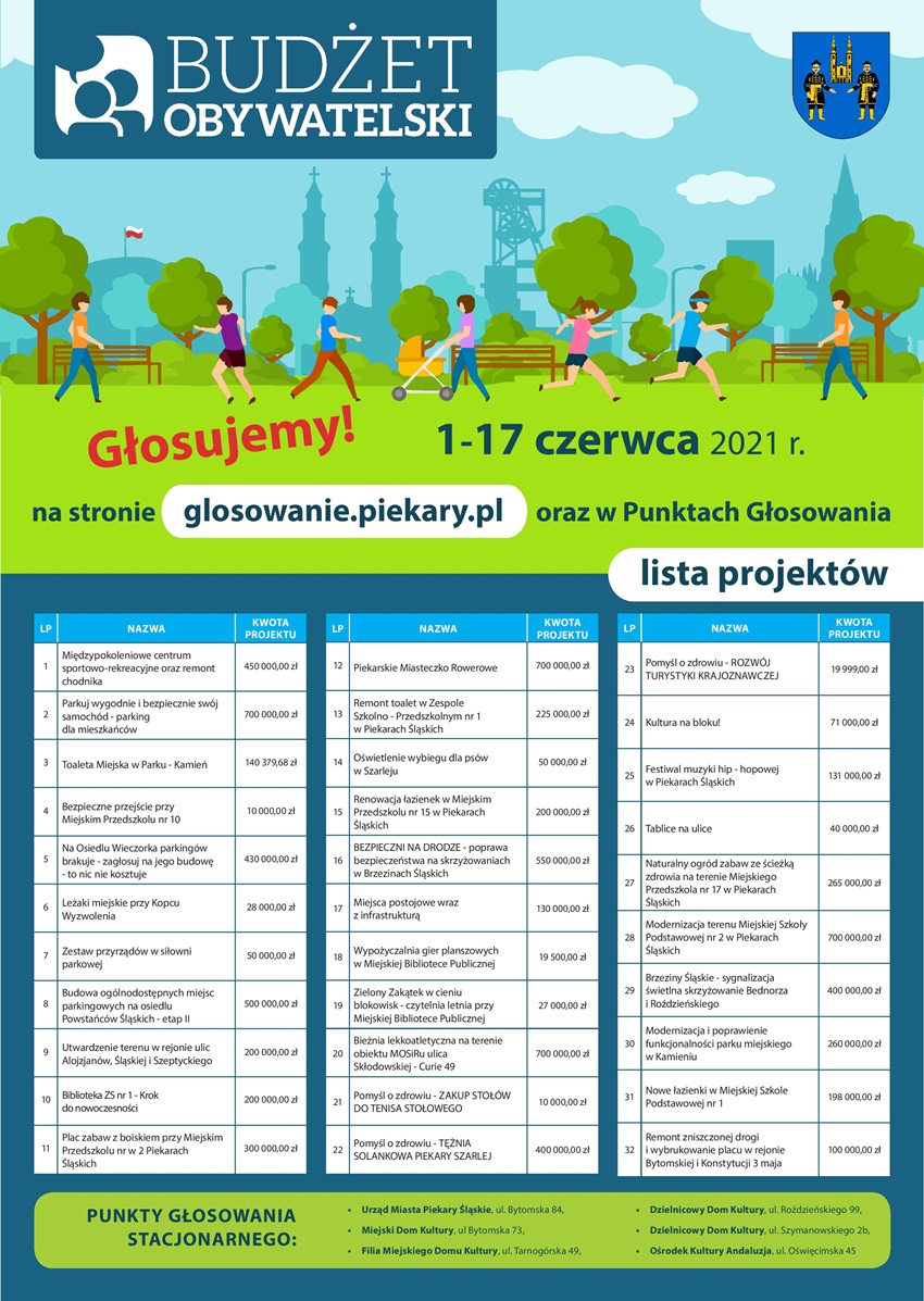 Głosować będzie można maksymalnie na trzy wybrane przez siebie propozycje, przyznając im odpowiednio 1, 2 lub 3 punkty. Będzie to możliwe od 1 czerwca zarówno poprzez stronę internetową glosowanie.piekary.pl , jak i tradycyjnie – w stacjonarnych punktach znajdujących się na terenie miasta, gdzie wypełnia się formularze w formie papierowej.
