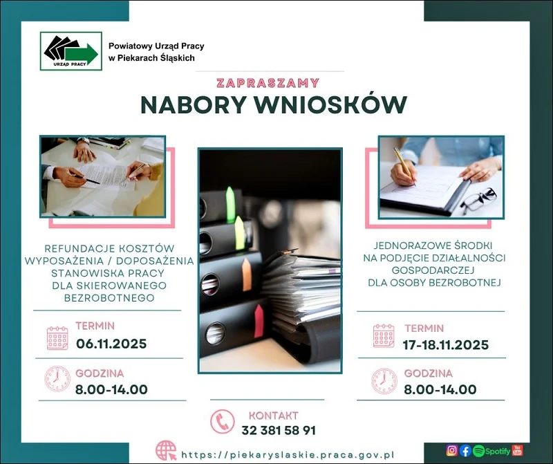 Powiatowy Urząd Pracy w Piekarach Śląskich uruchamia III nabór wniosków finansowanych ze środków Funduszu Pracy oraz Europejskiego Funduszu Społecznego Plus (EFS+). Dokumenty należy złożyć osobiście w siedzibie urzędu, w wyznaczonych dniach i godzinach.