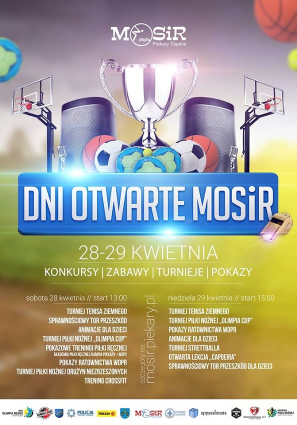 Turniej tenisa ziemnego, sprawnościowy tor przeszkód, animacje dla dzieci, turnieje piłki nożnej, pokazowe treningi piłki ręcznej (Akademia Piłki Ręcznej Olimpia Piekary), turniej szachowy, pokazy ratownictwa, trening crossfit, animacje dla dzieci, streetball, otwarta lekcja capoeira, pokazy policyjne oraz sprawnościowy tor przeszkód dla dzieci. Wśród takich atrakcji będzie można wybierać podczas Dni Otwartych MOSiR, które odbędą się już 28 i 29 kwietnia na terenie obiektów sportowych przy ul. Olimpijskiej 3. W sobotę, 28 kwietnia, zabawę rozpoczniemy już o godz. 13.00, natomiast w niedzielę start przewidziano na godzinę 15.00.