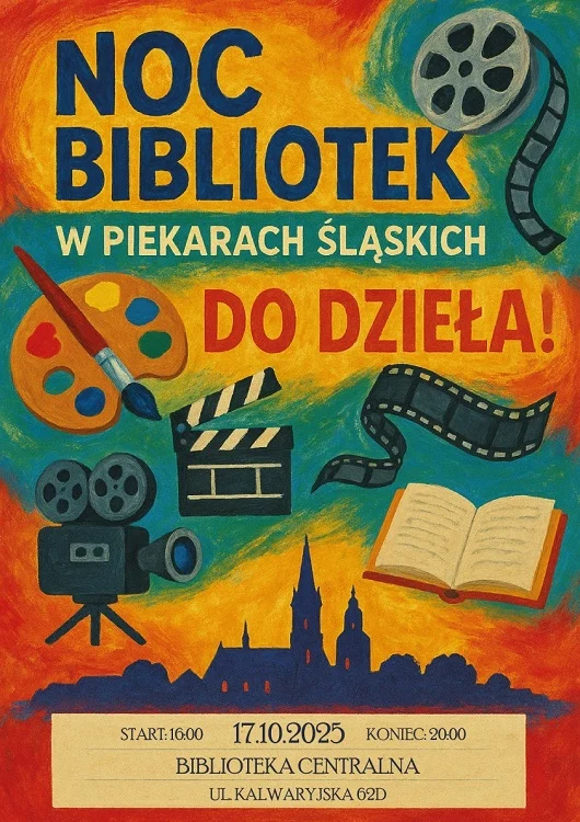 Miejska Biblioteka Publiczna im. Teodora Heneczka w Piekarach Śląskich zaprasza na Noc Bibliotek 2025, która odbędzie się 9 października pod hasłem „Do dzieła!”. Tegoroczna edycja wprowadzi uczestników w świat kreatywności, literatury i filmowych przygód. Spotkanie rozpocznie się o godzinie 16:00 w Bibliotece Centralnej przy ul. Kalwaryjskiej 62d.