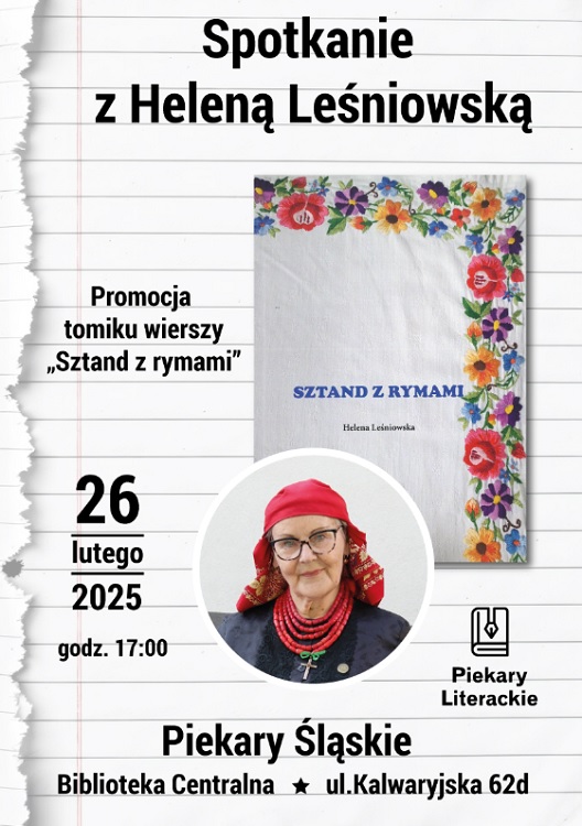 26 lutego o godzinie 17:00 w Bibliotece Centralnej odbędzie się spotkanie z Heleną Leśniowską, autorką książki „Sztand z rymami”. W trakcie wydarzenia PaniHelena zaprezentuje wiersze ze swojego najnowszego tomiku, który w całości napisany jest w języku śląskim.