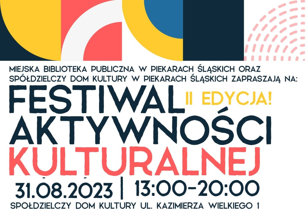 Spółdzielczy Dom Kultury i Klub Spółdzielni Mieszkaniowej w Piekarach Śląskich wraz z Miejską Biblioteką Publiczną im. Teodora Heneczka w Piekarach Śląskich zapraszają na II edycję Festiwalu Aktywności Kulturalnej, który będzie okazją do zaprezentowania bogatej oferty kulturalnej naszego regionu. Wydarzenie odbędzie się 31 sierpnia 2023 r. w godzinach 13:00-20:00 w Spółdzielczym Domu Kultury przy ul. Kazimierza Wielkiego 1 . Wstęp wolny!