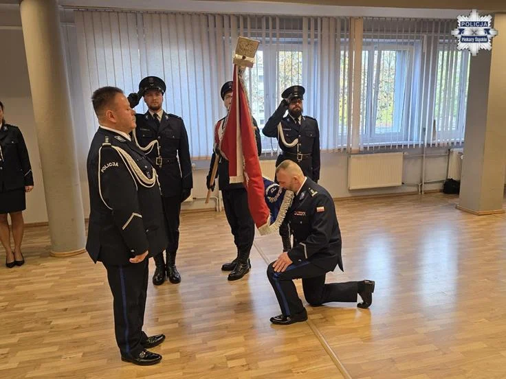 Po odczytaniu rozkazu insp. Paweł Dratwiński pożegnał się ze sztandarem Komendy Miejskiej Policji w Piekarach Śląskich, a insp. Sławomir Bylicki oficjalnie przywitał się z symbolem jednostki, obejmując obowiązki jej komendanta.