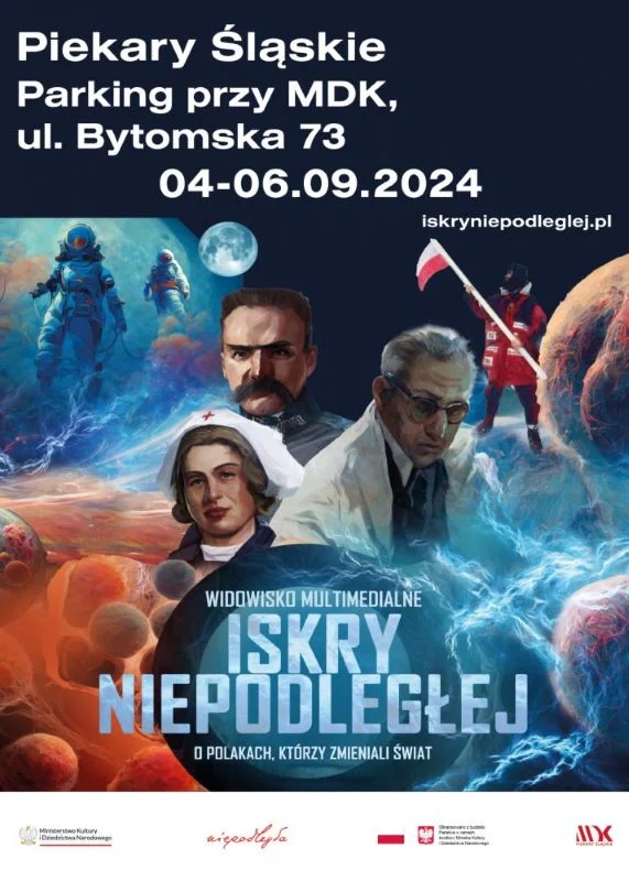 Miejski Dom Kultury w Piekarach Śląskich serdecznie zaprasza od 4 do 6 września na wyjątkowe wydarzenie – Iskry Niepodległej, nowoczesny spektakl multimedialny umieszczony w unikatowej naczepie ekspozycyjnej, która podróżuje po całej Polsce. Widowisko, stworzone z wykorzystaniem zaawansowanych technologii wizualnych, opowiada o wybitnych Polkach i Polakach, którzy zmieniali świat, realizując swój potencjał i pozostawiając trwały ślad w różnych dziedzinach życia, takich jak technika, medycyna, nauka, kultura, eksploracja kosmosu czy sport.