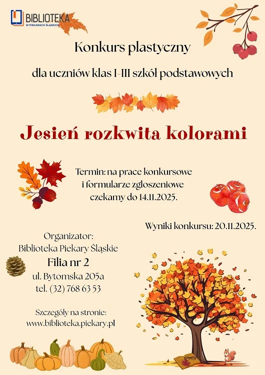 Konkurs „Jesień rozkwita kolorami” przygotowała Filia nr 2 MBP im. Teodora Heneczka przy ul. Bytomskiej 205a. Udział mogą wziąć uczniowie klas I–III szkół podstawowych. Zadaniem uczestników jest wykonanie pracy na papierze formatu A4, dowolną techniką (np. rysunek, kolaż), na temat symboli i barw jesieni. Każdą pracę należy podpisać imieniem i nazwiskiem na odwrocie i dostarczyćdo biblioteki w godzinach jej pracy najpóźniej do 14 listopada.
