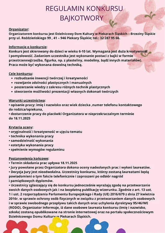 Konkurs „Bajkotwory” prowadzi Dzielnicowy Dom Kultury w Piekarach Śląskich – Brzeziny Śląskie, ul. Roździeńskiego 99. Adresatami są dzieci w wieku 6–10 lat.