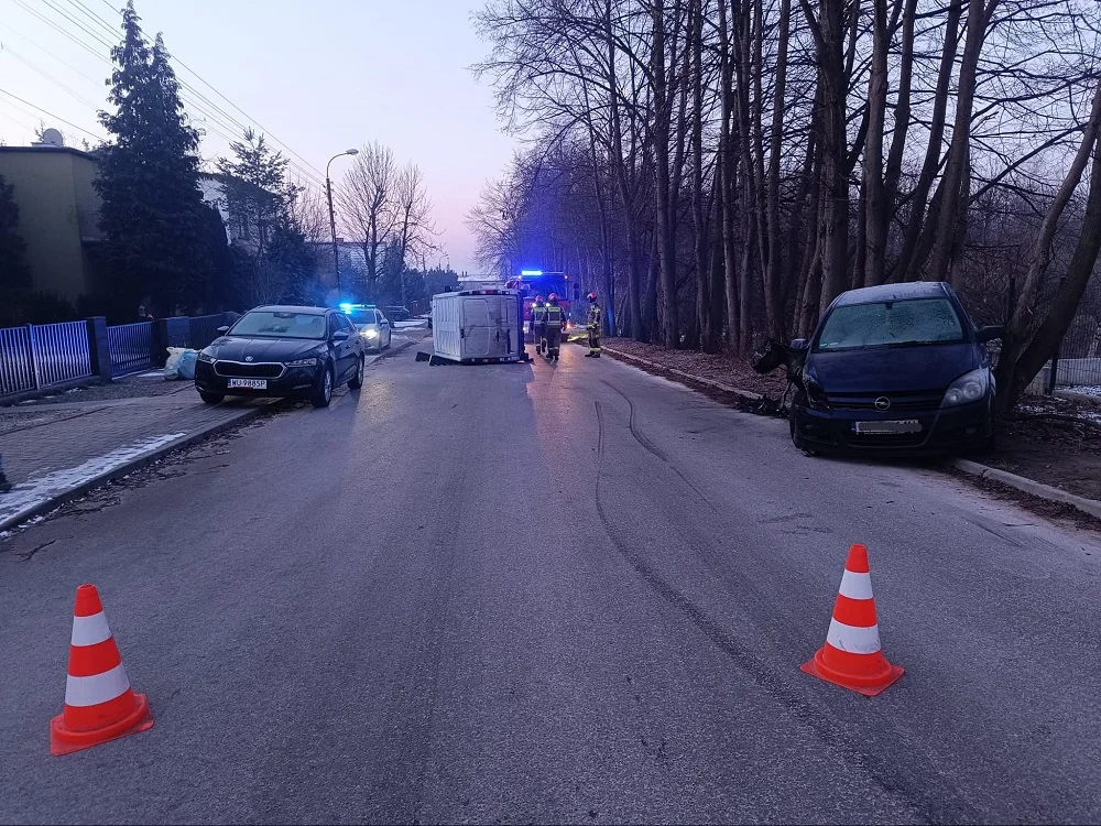 Kolizja na ul. Kasztanowej – dostawczy opel przewrócił się na bok