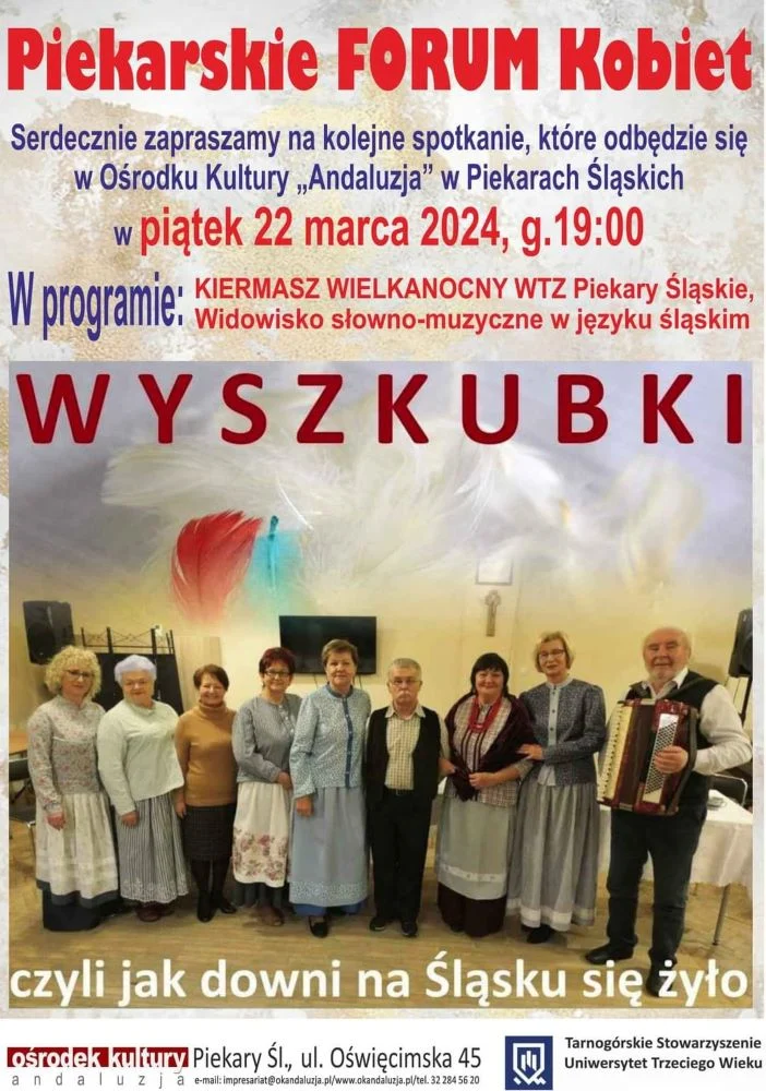 Urząd Miasta zaprasza na kolejne spotkanie, które odbędzie się w Ośrodku Kultury „Andaluzja” przy ul. Oświęcimskiej 45 w Piekarach Śląskich. Marcowe Piekarskie Forum Kobiet odbędzie się w piątek 22 marca o godzinie 19.00. Tym razem w programie: Kiermasz Wielkanocny WTZ Piekary Śląskie i widowisko słowno-muzyczne w języku śląskim.