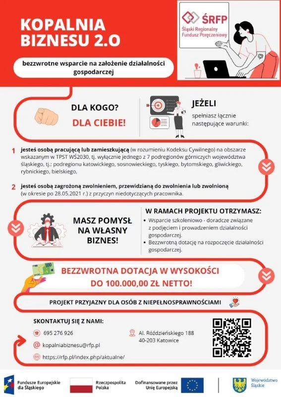 Śląski Regionalny Fundusz Poręczeniowy Sp. z o.o. z Katowic wraz z Partnerem Zachodniopomorską Grupą Doradczą Sp. z o.o. ze Szczecina realizuje projekt pt.: „KOPALNIA BIZNESU 2.0! – bezzwrotne wsparcie na założenie działalności gospodarczej” współfinansowany ze środków Unii Europejskiej w ramach Funduszy Europejskich dla Śląskiego 2021-2027.