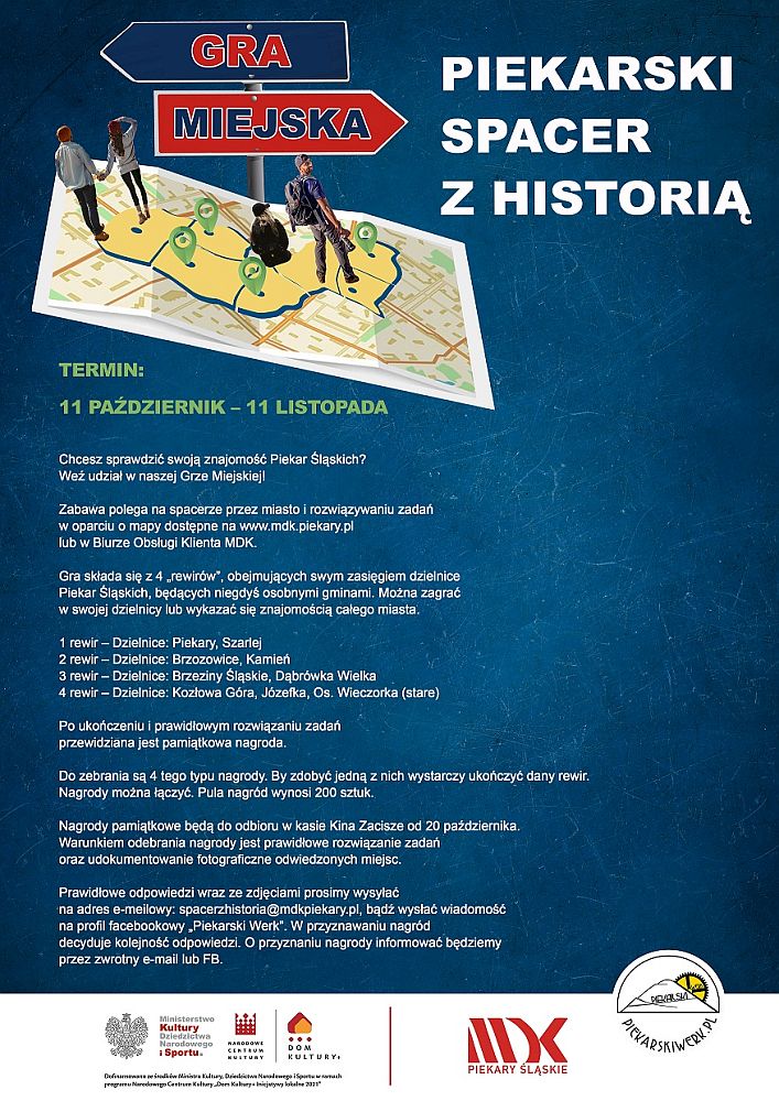 Chcesz sprawdzić swoją znajomość Piekar Śląskich? Weź udział w Grze Miejskiej przygotowanej przez Miejski Dom Kultury w Piekarach Śląskich! Zabawa polega na spacerze przez miasto i rozwiązywaniu zadań w oparciu o mapy dostępne na www.mdk.piekary.pl lub w Biurze Obsługi Klienta MDK.