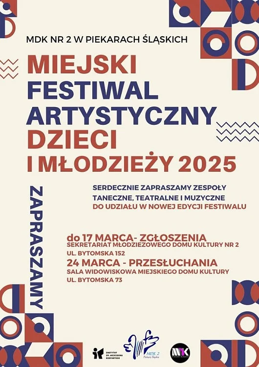 Młodzieżowy Dom Kultury nr 2 w Piekarach Śląskich, we współpracy z Instytutem im. Wojciecha Korfantego oraz Miejskim Domem Kultury, zaprasza do udziału w Miejskim Festiwalu Artystycznym Dzieci i Młodzieży. Celem festiwalu jest prezentacja dorobku artystycznego przedszkoli, szkół i placówek oświatowo-wychowawczych w zakresie wychowania artystycznego. Festiwal stanowi doskonałą okazję do wymiany doświadczeń oraz wytyczenia dalszych perspektyw dla rozwoju amatorskiego ruchu artystycznego.