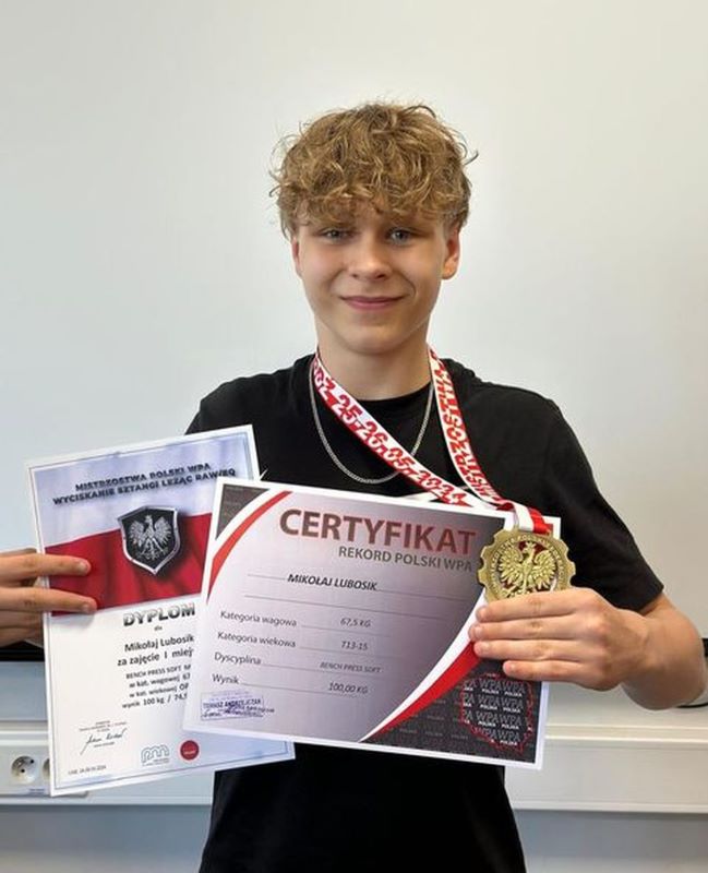 Mikołaj Lubosik, który jest uczniem 1 klasy technikum ZS1 w wolnym czasie realizuje swoją pasję i to z nie małymi sukcesami. Podczas Mistrzostw Polski federacji WPA – Benchpress soft EQ odbywających się w Łodzi, zdobył pierwsze miejsce w kategorii wagowej 67,5 kg, kategorii wiekowej 13 – 15 lat. Mikołaj swoim występem ustanowił również nowy rekord Polski 100 kg.