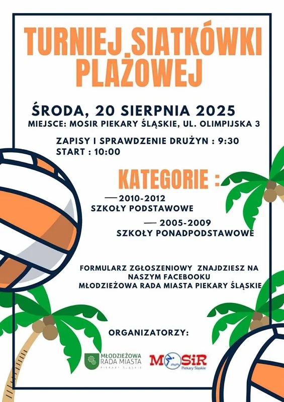 Młodzieżowa Rada Miasta Piekary Śląskie zaprasza do udziału w Turnieju Siatkówki Plażowej, który odbędzie się w środę, 20 sierpnia na terenie Miejskiego Ośrodka Sportu i Rekreacji w Piekarach Śląskich przy ul. Olimpijskiej 3. Wydarzenie jest skierowane do uczniów szkół podstawowych i ponadpodstawowych, którzy chcą aktywnie spędzić czas, dobrze się bawić i powalczyć o sportowe trofea.