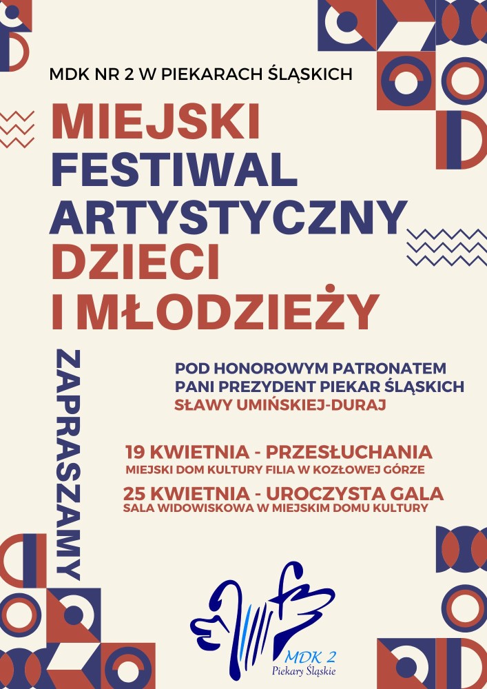 Młodzieżowy Dom Kultury nr 2 w Piekarach Śląskich zaprasza do udziału w Miejskim Festiwalu Artystycznym Dzieci i Młodzieży pod honorowym patronatem Sławy Umińskiej-Duraj – Prezydent Miasta.