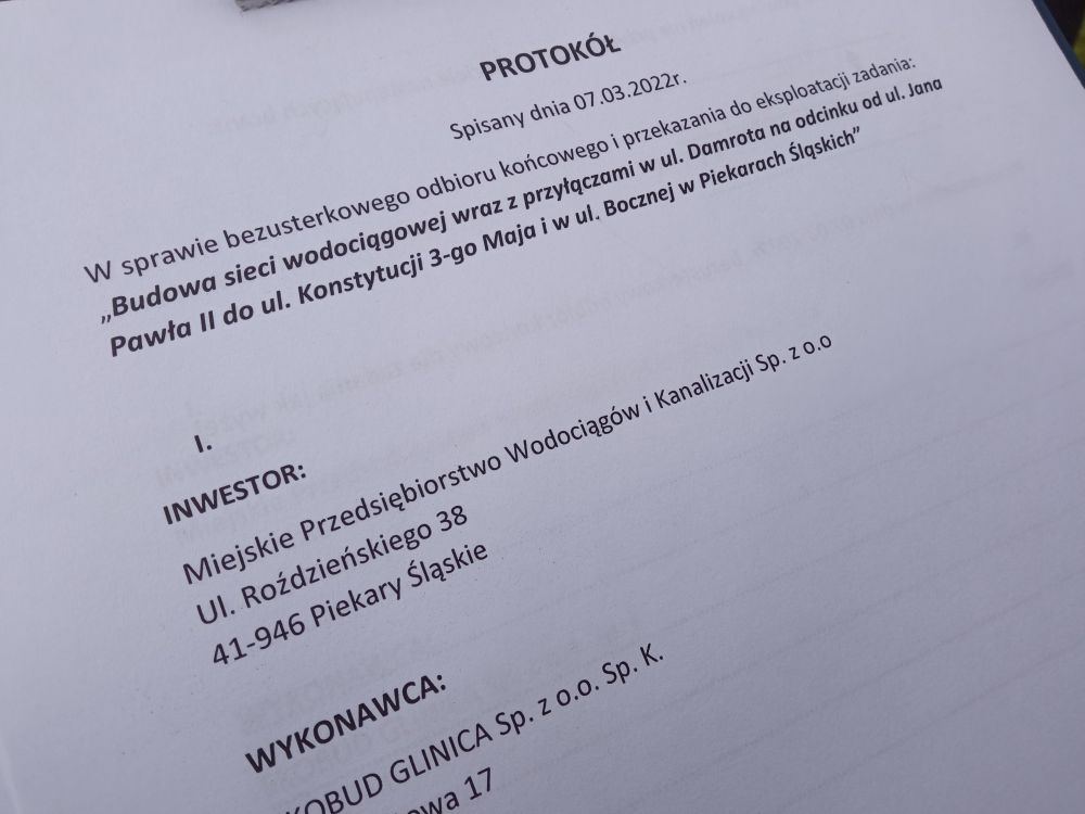 W ostatnich dniach Miejskie Przedsiębiorstwo Wodociągów i Kanalizacji sp. z o.o. dokonało odbiorów końcowych dwóch inwestycji: budowy sieci wodociągowej wraz z przyłączami w ul. Damrota na odcinku od ul. Jana Pawła II do Konstytucji 3 Maja i w ul. Bocznej oraz przebudowy sieci kanalizacji sanitarnej w rejonie ul. Szpitalnej.