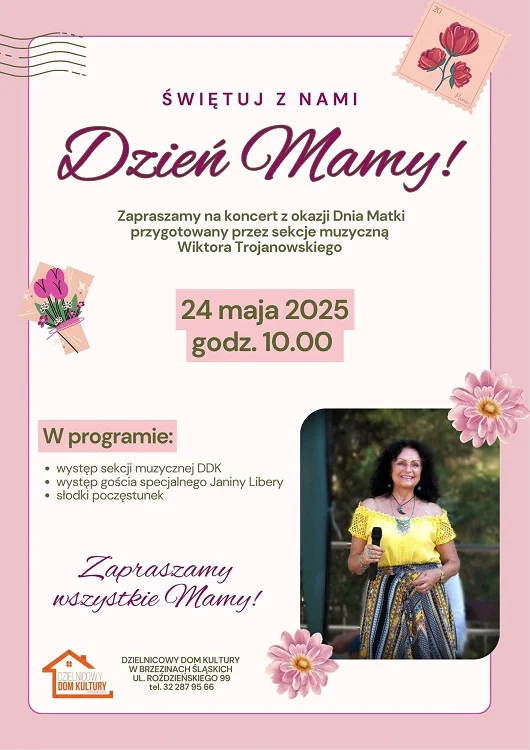 Na Dzień Matki zaprasza także Dzielnicowy Dom Kultury w Brzezinach Śląskich. 24 maja o godz. 10:00 odbędzie się koncert przygotowany przez sekcję muzyczną Wiktora Trojanowskiego. W programie przewidziano występ sekcji muzycznej DDK oraz specjalnego gościa – Janinę Liberę. Na wszystkich uczestników czeka także słodki poczęstunek.