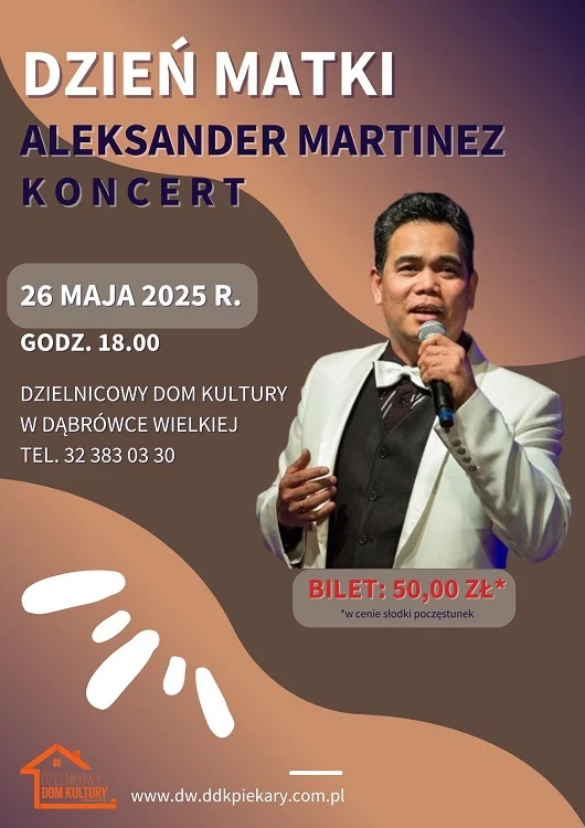 W Dzielnicowym Domu Kultury w Dąbrówce Wielkiej 26 maja o godzinie 18:00 wystąpi Aleksander Martinez. Bilet na koncert kosztuje 50 złotych i obejmuje słodki poczęstunek. To doskonała propozycja dla wszystkich, którzy chcą uczcić Dzień Matki w kameralnej atmosferze przy dźwiękach muzyki wykonywanej na żywo.