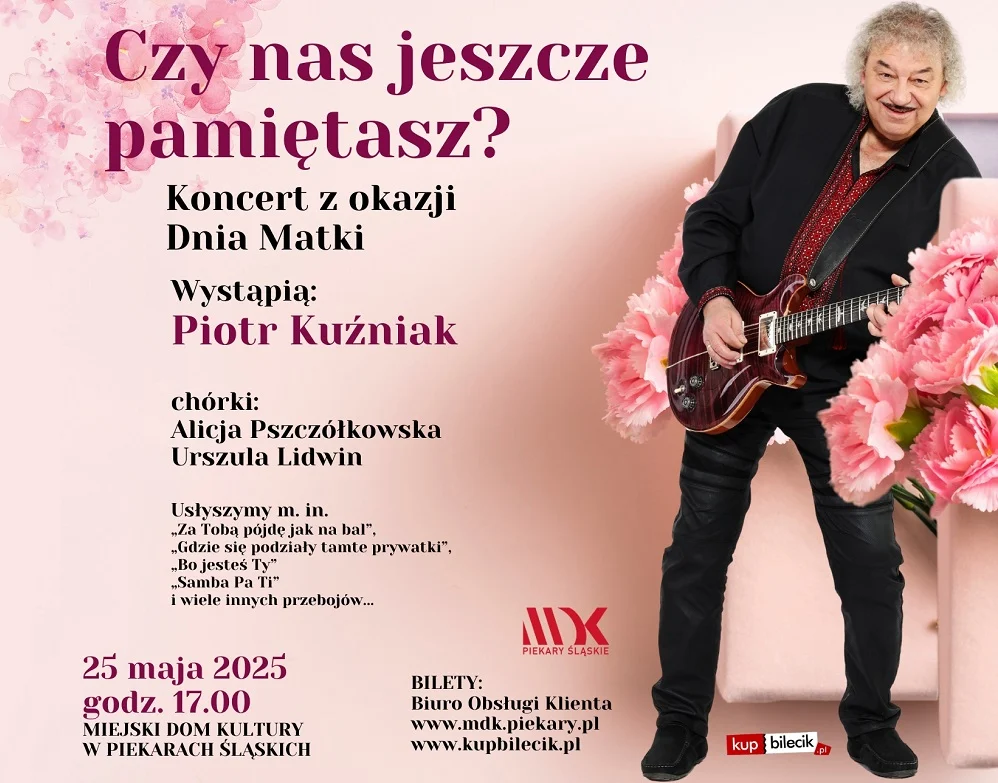 Już 25 maja o godz. 17.00 w Miejskim Domu Kultury w Piekarach Śląskich odbędzie się koncert z okazji Dnia Matki. Na scenie wystąpi Piotr Kuźniak z chórami Alicją Pszczółkowską i Urszulą Lidwin. Publiczność będzie miała okazję usłyszeć między innymi takie przeboje jak: „Za Tobą pójdę jak na bal”, „Gdzie się podziały tamte prywatki” czy „Samba Pa Ti”. To muzyczna podróż pełna nostalgii i wzruszeń, która z pewnością poruszy serca słuchaczy.