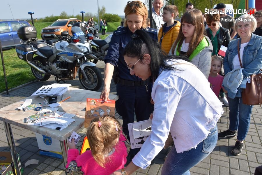 Obchody zakończył Majowy Piknik Rodzinny, podczas którego piekarscy policjanci wystawili stoisko profilaktyczne. Zgromadzeni goście pod Kopcem Wyzwolenia mogli zobaczyć m.in. policyjne motocykle, radiowozy, jak również wiele innych atrakcji umilających czas szczególnie najmłodszym uczestnikom uroczystości. Spotkanie było też doskonałą okazją do przeprowadzenia rozmów z rodzicami na temat bezpieczeństwa pociech w ramach trwającej kampanii “Mamo! Tato! Tutaj jestem”. Mundurowi z piekarskiej drogówki mając na uwadze rozpoczynający się sezon motocyklowy oraz w ramach prowadzonej akcji “Jednośladem bezpiecznie do celu” ostrzegali motocyklistów przed brawurą i brakiem rozsądku za kierownicą.