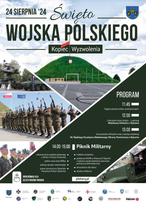 24 sierpnia przy Kopcu Wyzwolenia w Piekarach Śląskich odbędą się obchody Święta Wojska Polskiego, na które zapraszają Prezydent Piekar Śląskich Sława Umińska-Kajdan oraz przewodniczący Rady Miasta Tomasz Wesołowski. Po oficjalnych obchodach rozpocznie się Piknik Militarny.