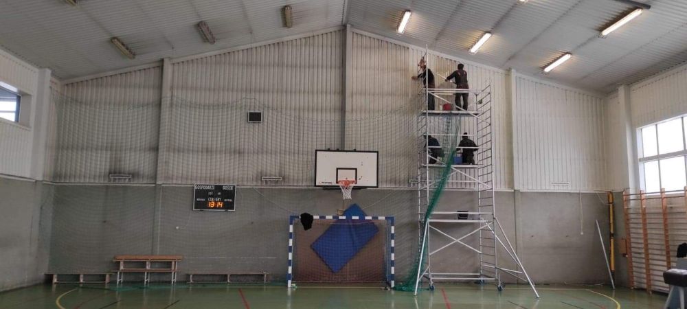 • montaż gumowych odbojnic w ścianach do składowania słupków do siatkówki.