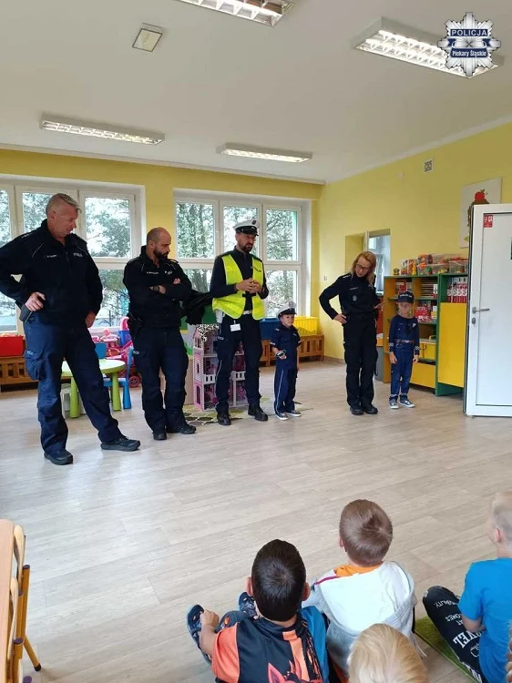 Dzielnicowi opowiadali także o swojej pracy i zadaniach, jakie wykonują na co dzień, odpowiadając na liczne pytania przedszkolaków. Dzieci mogły dowiedzieć się, jak wygląda życie policjanta i jakie wyzwania niesie ze sobą ta praca. Na koniec nie zabrakło wspólnych zdjęć oraz uśmiechów, które na długo zapadną w pamięci małych uczestników spotkania.
