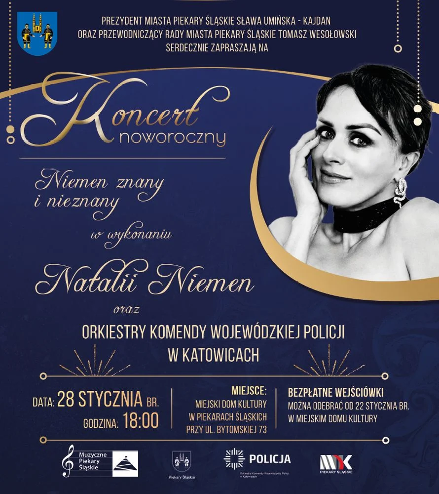 Sława Umińska-Kajdan – Prezydent Piekar Śląskich oraz Tomasz Wesołowski – Przewodniczący Rady Miasta serdecznie zapraszają wszystkich mieszkańców Piekar Śląskich na koncert noworoczny „Niemen znany i nieznany” w wykonaniu Natalii Niemen oraz Orkiestry Komendy Wojewódzkiej Policji w Katowicach, który odbędzie się 28 stycznia 2024 roku o godzinie 18.00 w Miejskim Domu Kultury przy ul. Bytomskiej.