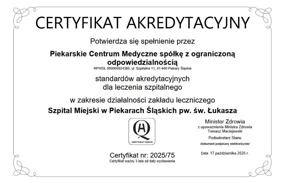 17 października Minister Zdrowia przyznał Piekarskiemu Centrum Medycznemu Certyfikat Akredytacyjny nr 2025/75. Dokument ten potwierdza, że szpital spełnia standardy akredytacyjne dla leczenia szpitalnego określone dla placówek działających w publicznym systemie ochrony zdrowia.