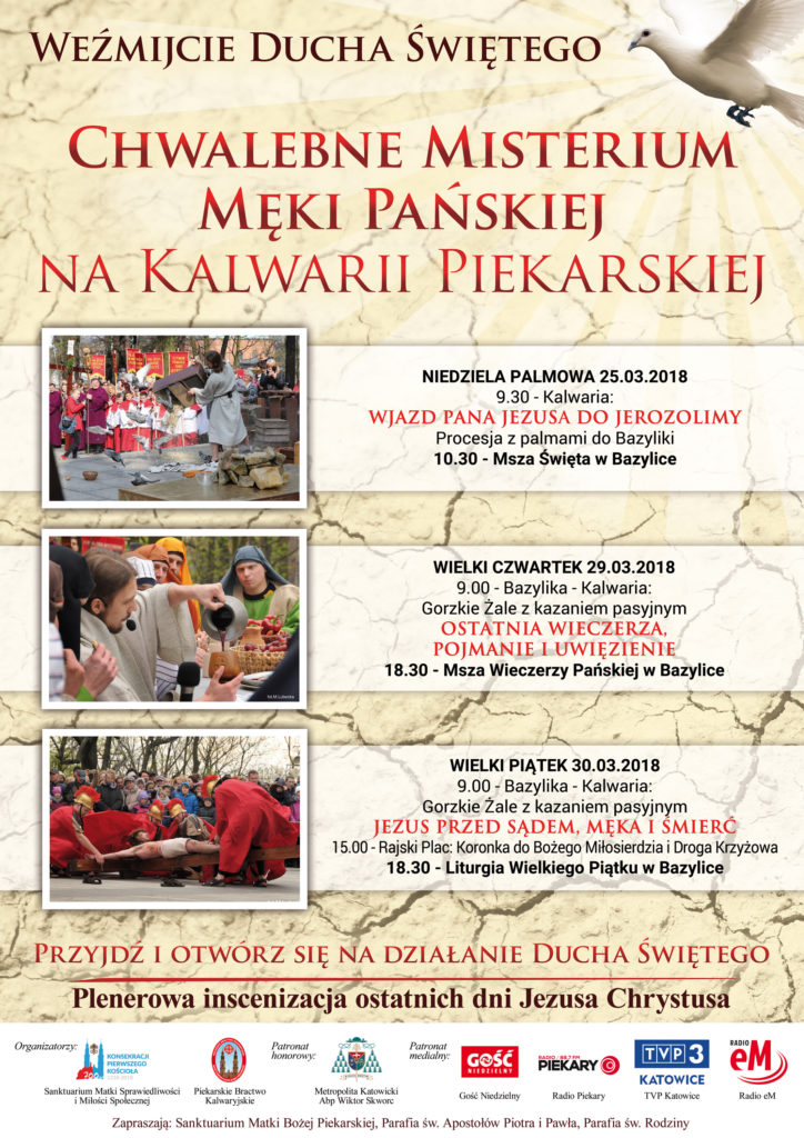W Niedzielę Palmową (o godz. 9:30), w Wielki Czwartek i Wielki Piątek (o godz. 9:00) na piekarskiej Kalwarii zostaną odtworzone biblijne wydarzenia, związane z ostatnimi godzinami życia Boga Człowieka – Męka i Śmierć Pana Jezusa Chrystusa.