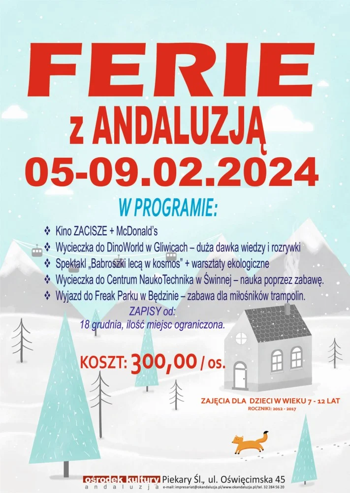 Ośrodek Kultury “Andaluzja” organizuje “Ferie z Andaluzją” w terminie od 5 do 9 lutego 2024 r. dla dzieci w wieku 7-12 lat (roczniki 2012-2017). Zapisy ruszą od 18 grudnia 2023 r. i będą przyjmowane wyłącznie osobiście, w kasie Ośrodka. Ilość miejsc ograniczona! W programie: