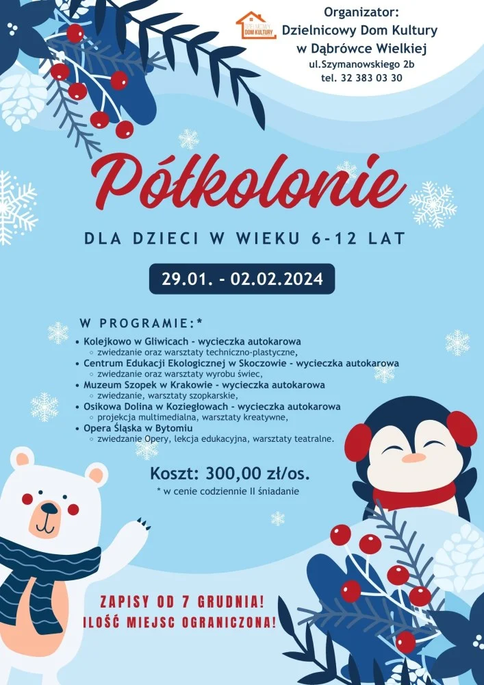Dzielnicowy Dom Kultury w Dąbrówce Wielkiej organizuje półkolonie zimowe w I tygodniu ferii, tj. od 29 stycznia do 2 lutego 2024 r. dla dzieci w wieku 6-12 lat. A w programie:
