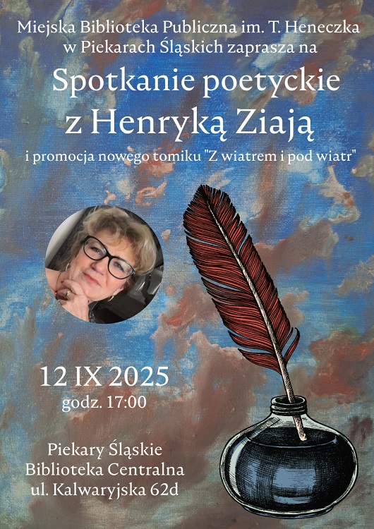 Miejska Biblioteka Publiczna im. Teodora Heneczka w Piekarach Śląskich zaprasza na wyjątkowe spotkanie z poetką Henryką Ziją, które odbędzie się 12 września o godz. 17:00 w Bibliotece Centralnej przy ul. Kalwaryjskiej 62d. Wieczór poetycki będzie okazją do promocji nowego tomiku poezji autorki pt. „Z wiatrem i pod wiatr”.