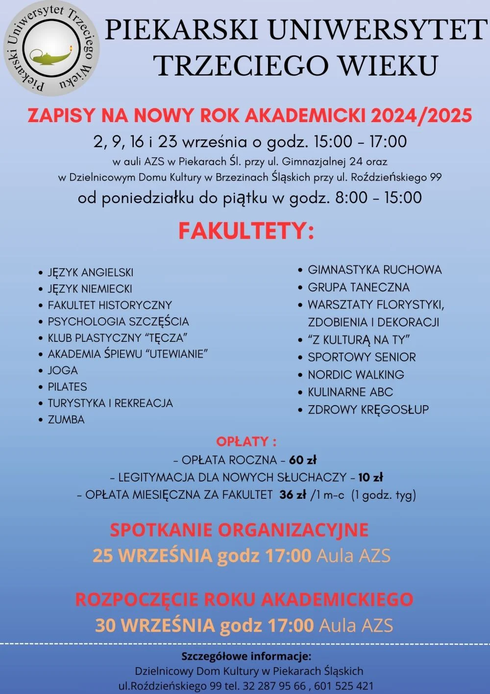 Zapisy na 19. Rok Akademicki 2024/2025 już ruszyły. Osoby zainteresowane mogą składać deklaracje od 2 września w Dzielnicowym Domu Kultury przy ul. Roździeńskiego 99 (poniedziałek-piątek, godz. 8:00–15:00) oraz 2, 9, 16 i 23 września w auli Akademickiego Zespołu Szkół przy ul. Gimnazjalnej 24 (15:00–17:00). Oferta zajęć fakultatywnych obejmuje: