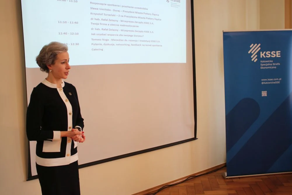 Prelekcję otworzyła prezydent Sława Umińska-Duraj witając przybyłych przedsiębiorców. W zebraniu uczestniczył także Krzysztof Turzański – I Zastępca Prezydenta Miasta Piekary Śląskie.