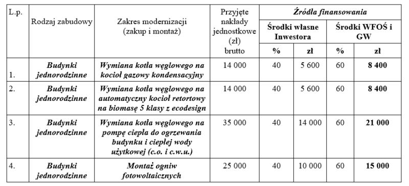 Każdy uczestnik Programu może uzyskać dotację w wysokości przedstawionej w poniższej tabeli, stanowiącą 60% kosztów wynikających z zatwierdzonego przez Operatora Programu i Gminę kosztorysu wykonawczego, lecz nie powyżej kwot ujętych w tabeli jako źródła finansowania WFOŚiGW.