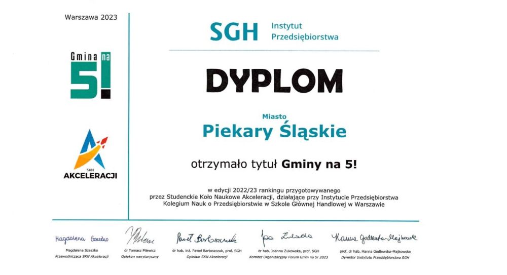 Piekary Śląskie otrzymały tytuł “Gmina na 5!” w edycji 2022/2023 rankingu przygotowanego przez Studenckie Koło Naukowe Akceleracji, działające w Szkole Głównej Handlowej w Warszawie.