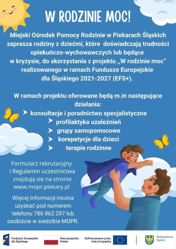 Gmina Piekary Śląskie uzyskała dofinansowanie na realizację projektu „W rodzinie moc”, współfinansowanego ze środków Unii Europejskiej w ramach programu Fundusze Europejskie dla Śląskiego 2021-2027. Projekt realizowany będzie przez Miejski Ośrodek Pomocy Rodzinie w Piekarach Śląskich, a jego głównym celem jest rozwój, podniesienie jakości i dostępności usług wsparcia rodzin, w tym rodzin przeżywających trudności opiekuńczo-wychowawcze lub będących w kryzysie.