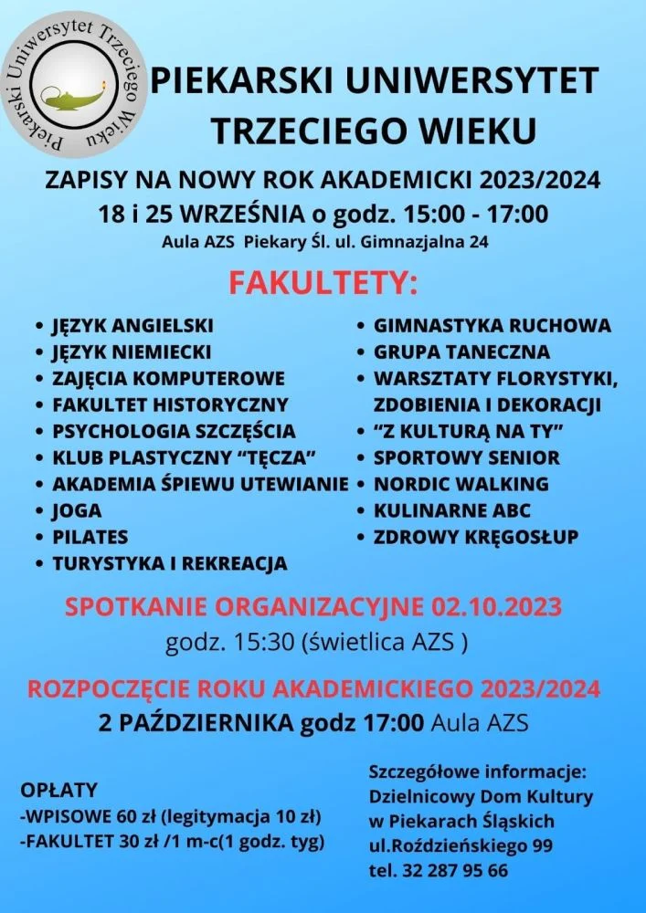 Udział w zajęciach przyczyni się, bez wątpliwości do aktywizacji mieszkańców Piekar Śląskich i stanie się dla nich ciekawym sposobem na spędzenie czasu wolnego. Wszystkim członkom zarządu UTW, słuchaczom oraz prowadzącym życzymy owocnych wykładów. Słuchaczem może zostać każda osoba powyżej 50. roku życia.