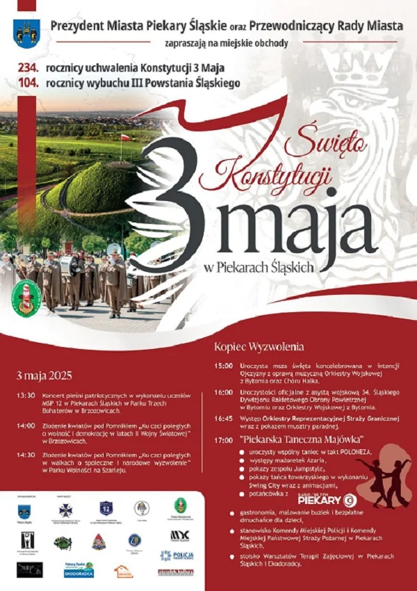 Piekary Śląskie zapraszają na wyjątkowe obchody rocznicy uchwalenia Konstytucji 3 Maja. To dzień pełen muzyki, patriotyzmu i wspólnej zabawy! Oprócz uroczystości upamiętniających zarówno Konstytucję 3 Maja, jak i 104. rocznicę wybuchu III Powstania Śląskiego, mieszkańcy miasta będą mogli cieszyć się koncertami, występami artystycznymi i… taneczną Majówką!