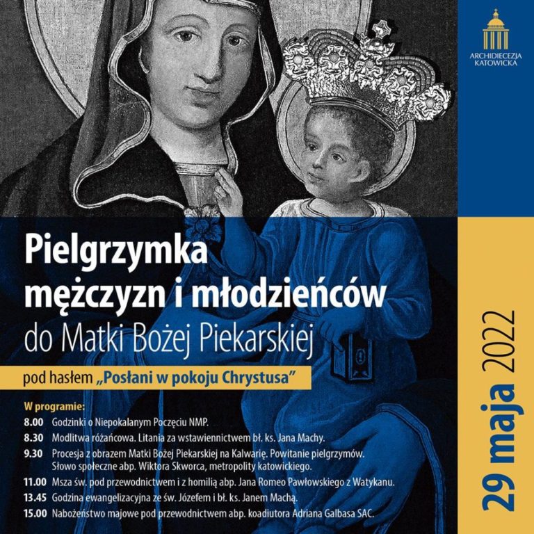 Tegoroczna Pielgrzymka Mężczyzn i Młodzieńców do Sanktuarium Matki Sprawiedliwości i Miłości Społecznej odbędzie się tradycyjnie w ostatnią niedzielę maja czyli 29 maja 2022 r. pod hasłem: “Posłani w pokoju Chrystusa”.