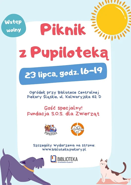 Miejska Biblioteka Publiczna w Piekarach Śląskich zaprasza na Piknik z Pupiloteką, który odbędzie się 23 lipca w Ogrodzie przy Bibliotece Centralnej przy ul. Kalwaryjskiej 62 D. To wydarzenie, które z pewnością przyciągnie wszystkich miłośników zwierząt i tych, którzy chcą poznać proces odpowiedzialnej adopcji psów i kotów.